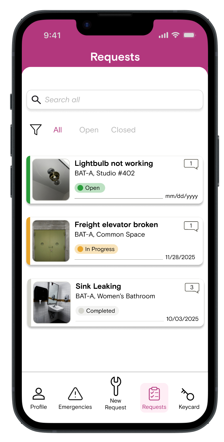 The requests dashboard allows users to track submitted workorders, offering a snapshot of each project’s timeline.