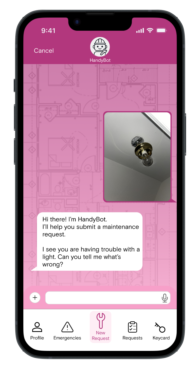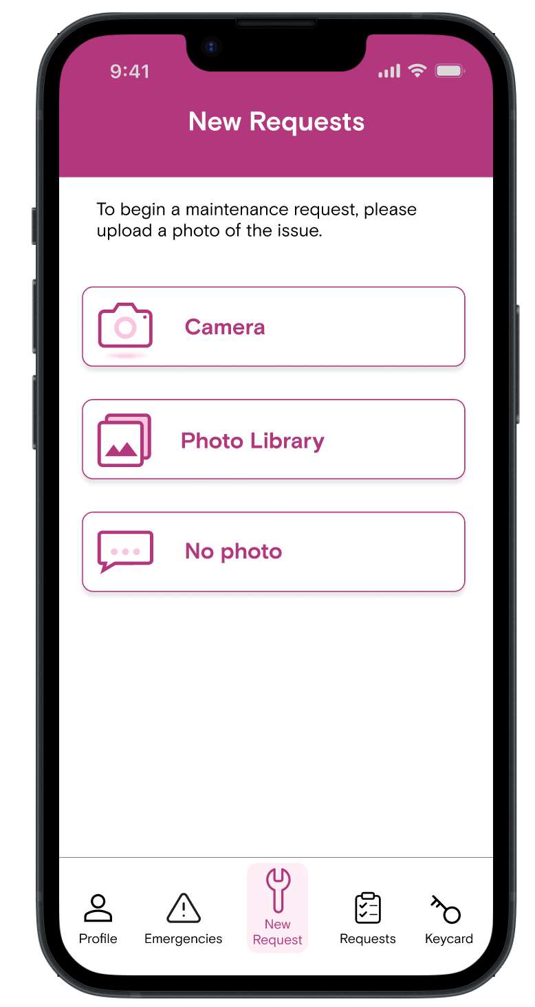 Users can quickly initiate a facilities request by snapping a photo in-app, uploading one from their library, or simply describing the issue.