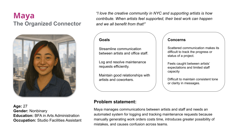 Transform facilities reporting into a supportive and human-centered experience for artists, shifting reactive workflows to a more transparent system?