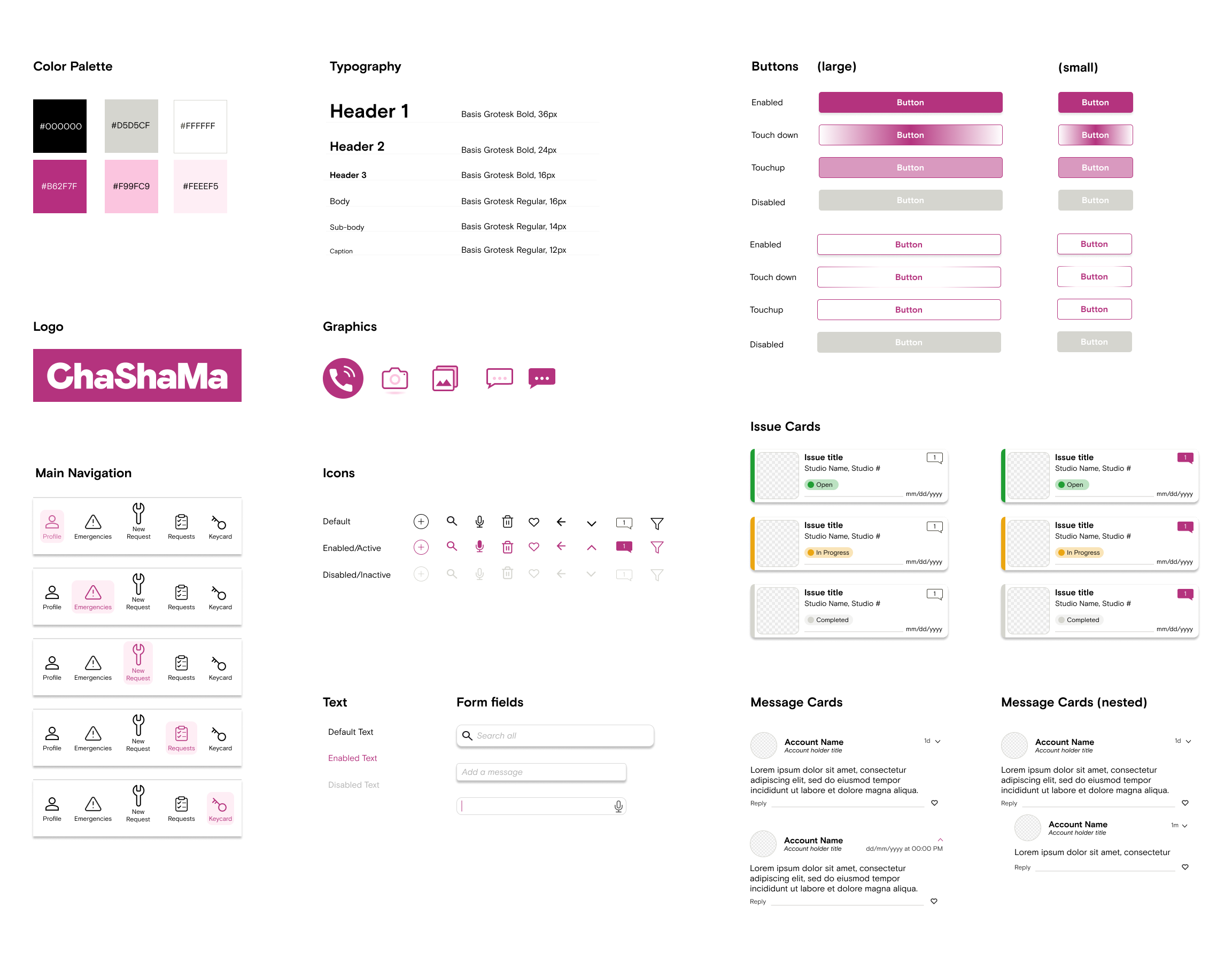 Following the mid-fidelity prototype, a style guide was created to define the app’s UI system. Presented as a sticker sheet, it includes reusable components, customized icons, and guidelines for common interface elements such as buttons, forms, and notifications.