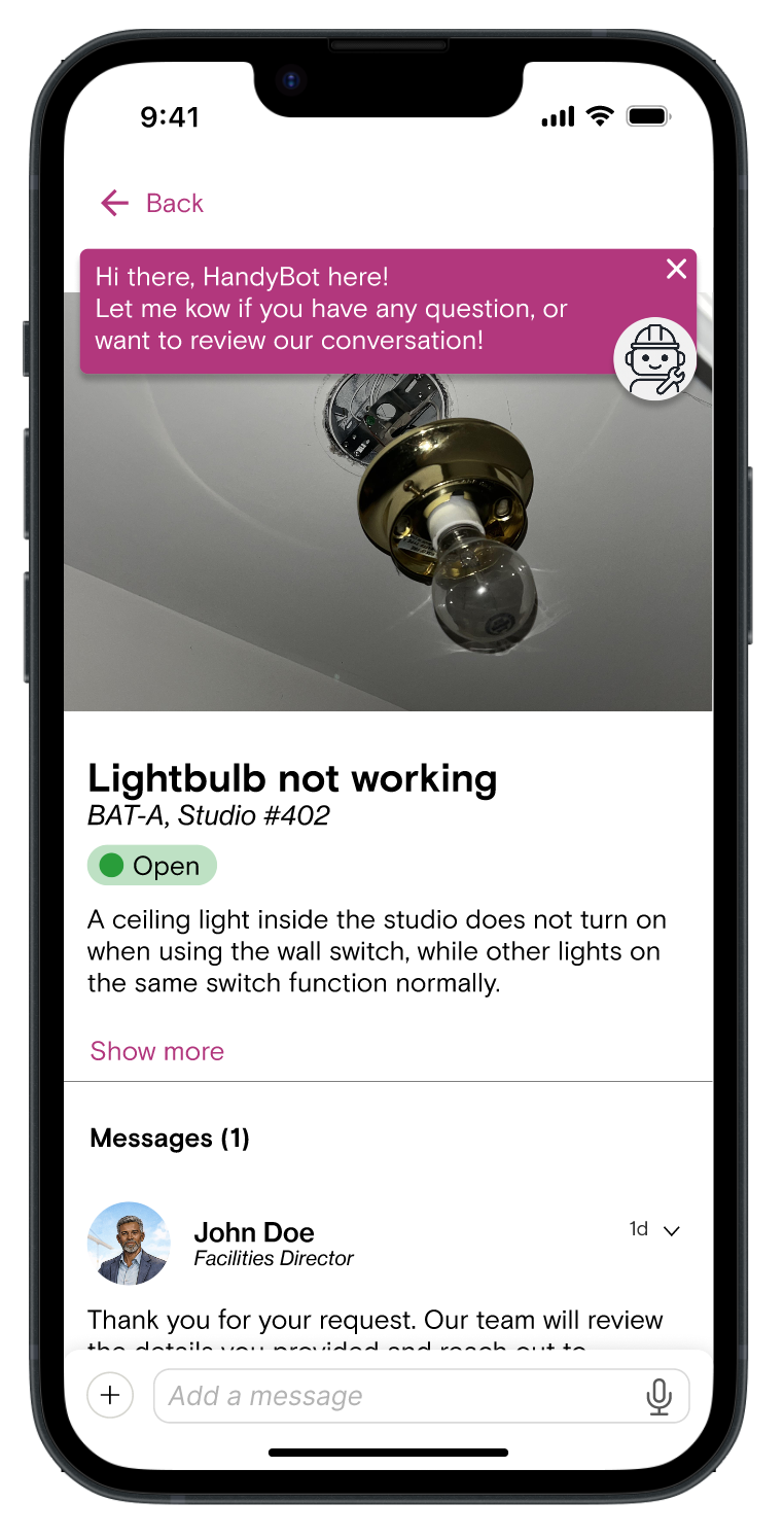 Users are empowered to message the facilities team directly on each request’s log, or chat more with HandyBot to review details or summaries.