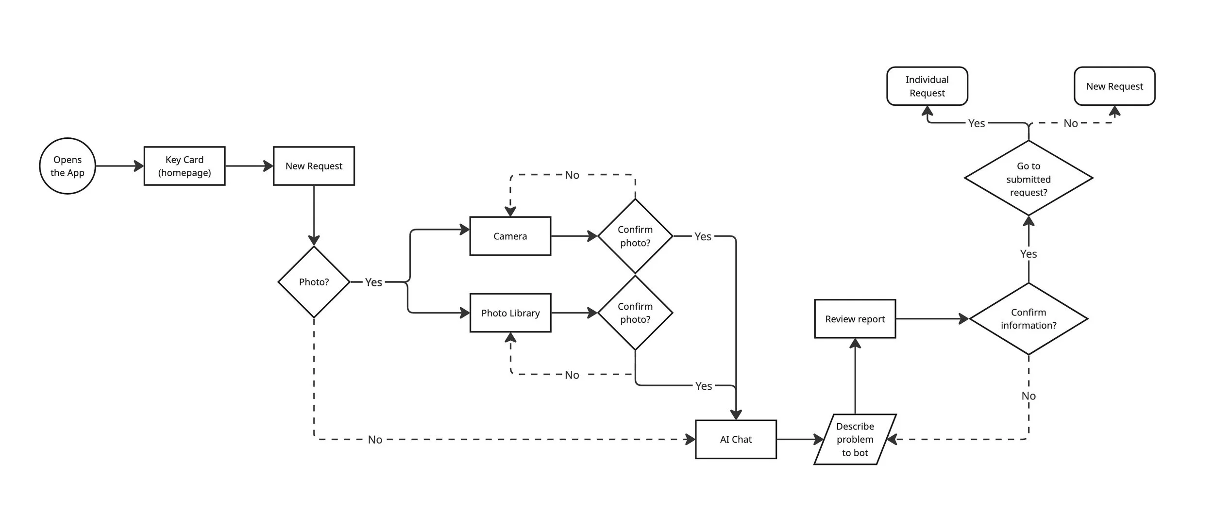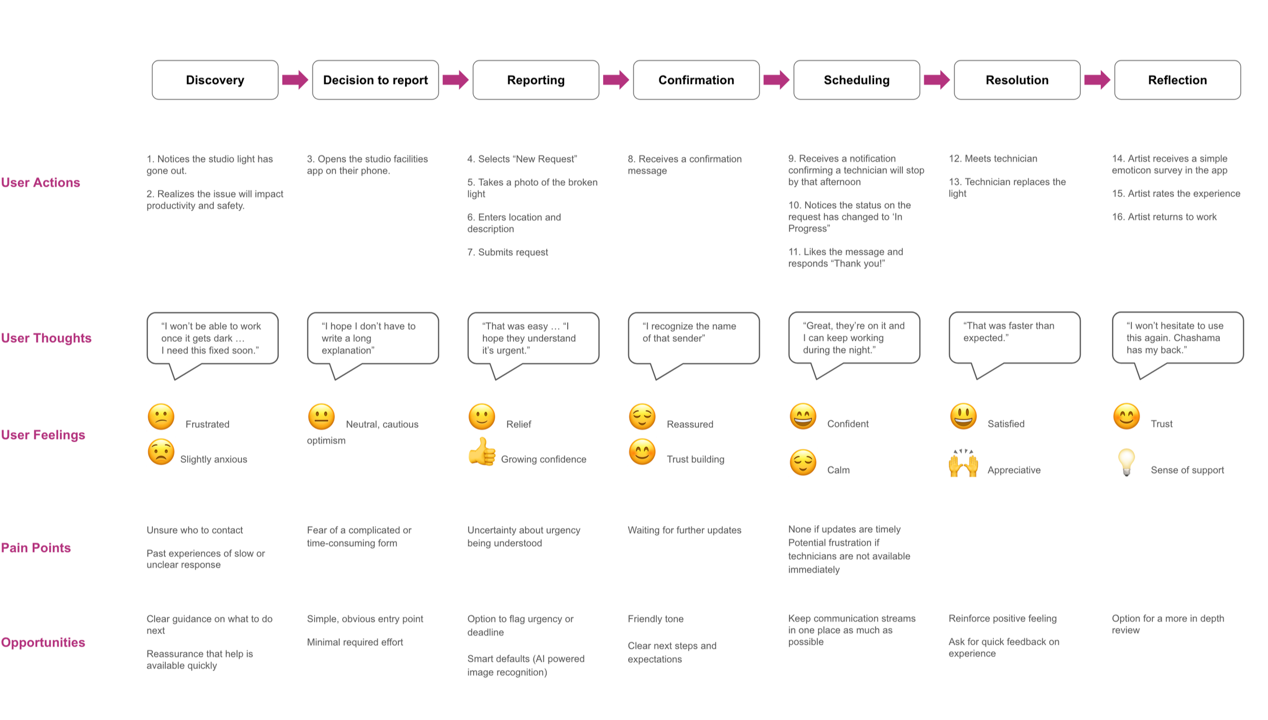 I created a user journey map to support concept development and identify where and how user pain points can be resolved or minimized. The journey represents the intended experience after implementation of the facilities reporting app.