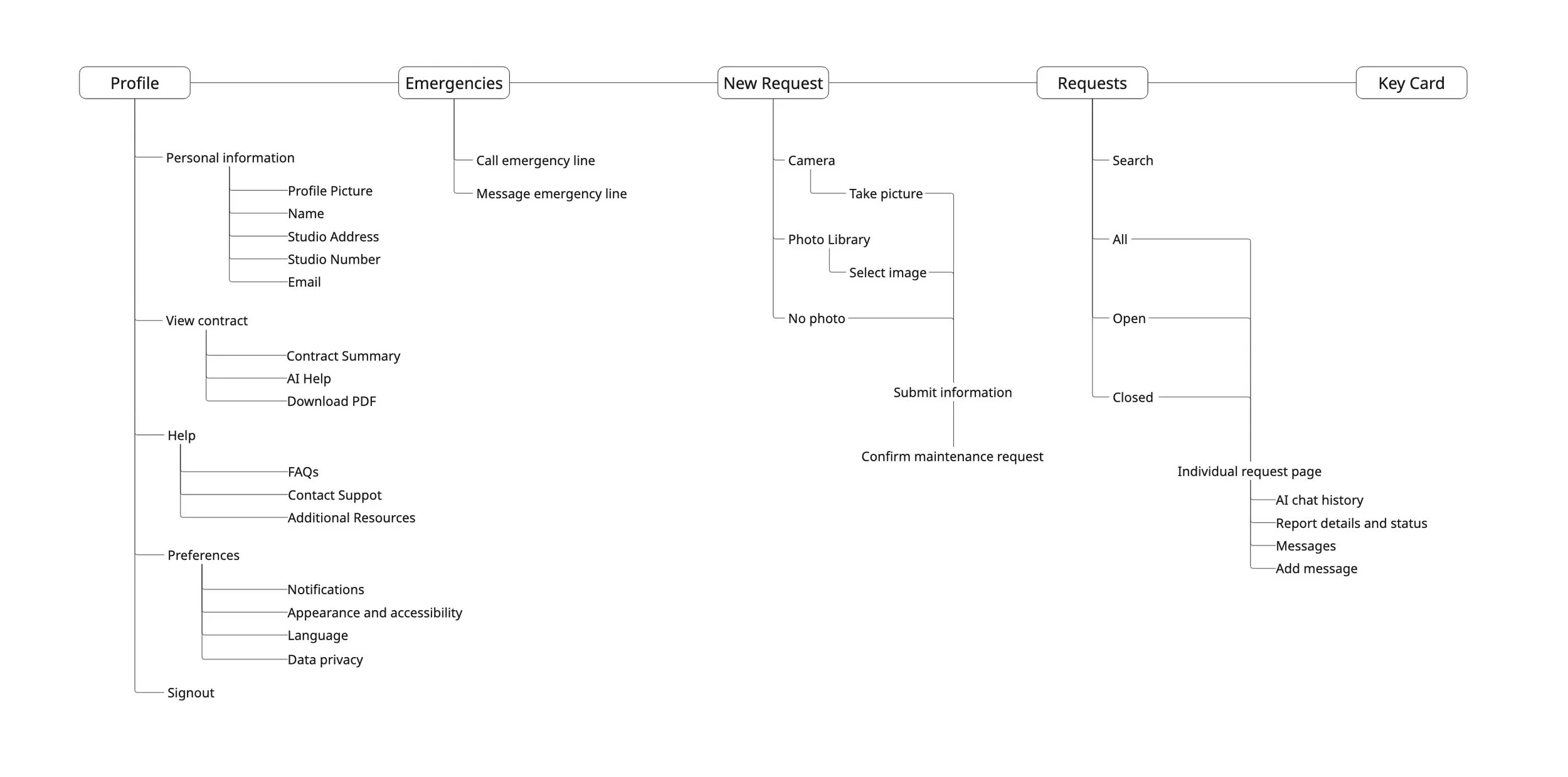 To present the most concise studio management platform with essential features in the foreground, the whole app experience is divided into 5 major segments easily accessible from every page through the navigation bar: Keycard, Requests, New Request, Emergencies, and Profile.