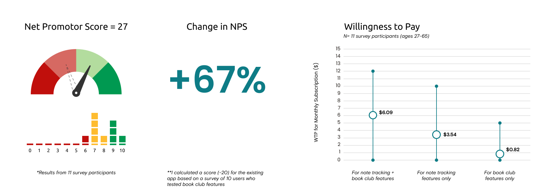 Digging into users’ price sensitivity revealed that the addition of note tracking features increased participants willingness to pay (WTP) and was viewed as a unique value. However, this was highly conditioned by a "network effect" and most users speculated WTP based on accessibility to their social circle.